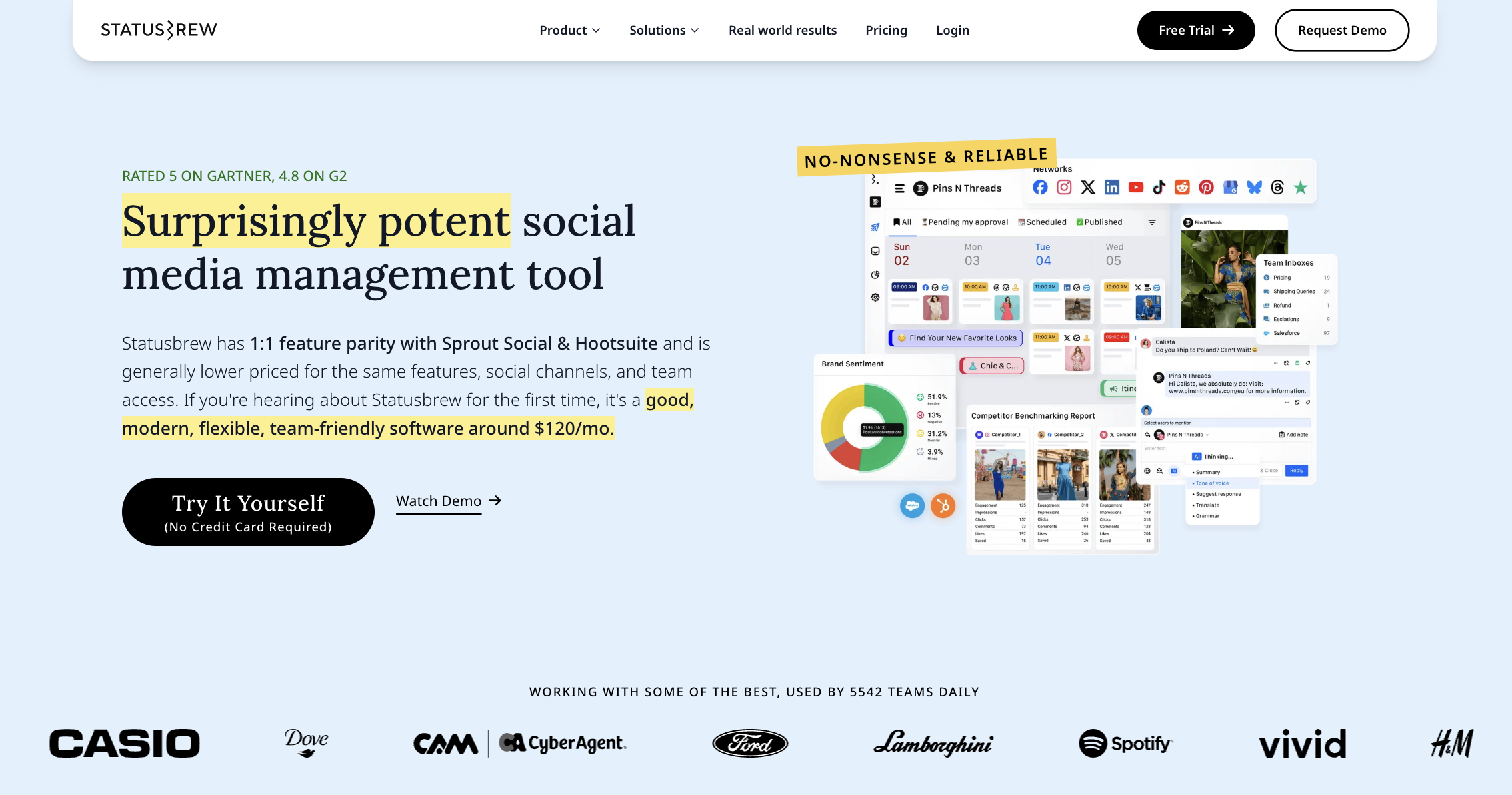 Statusbrew is a social media management platform built for agencies and growing teams that need powerful publishing, engagement, and reporting features, all in one place. Designed to bring structure to social workflows, Statusbrew helps you manage multiple brands or clients without the chaos of scattered tools or per-user pricing.