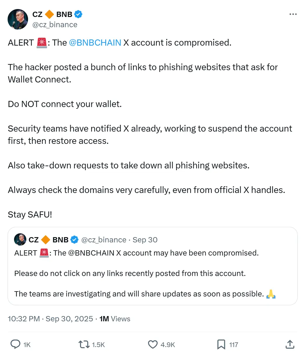 On October 1, Binance's official English X account for BNB Chain was hacked and briefly used to spread fraudulent "airdrop" links. The account promoted phishing scams disguised as WalletConnect prompts, tricking users into connecting their wallets and risking stolen funds.