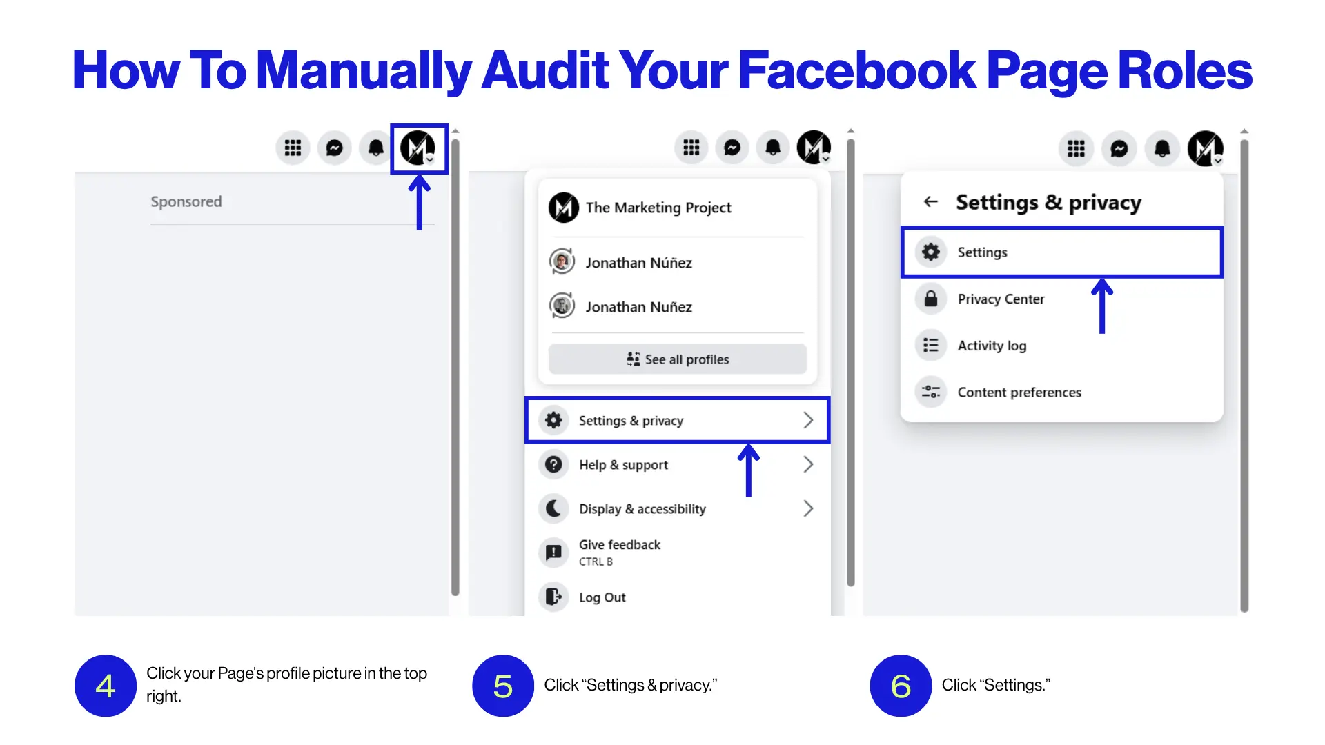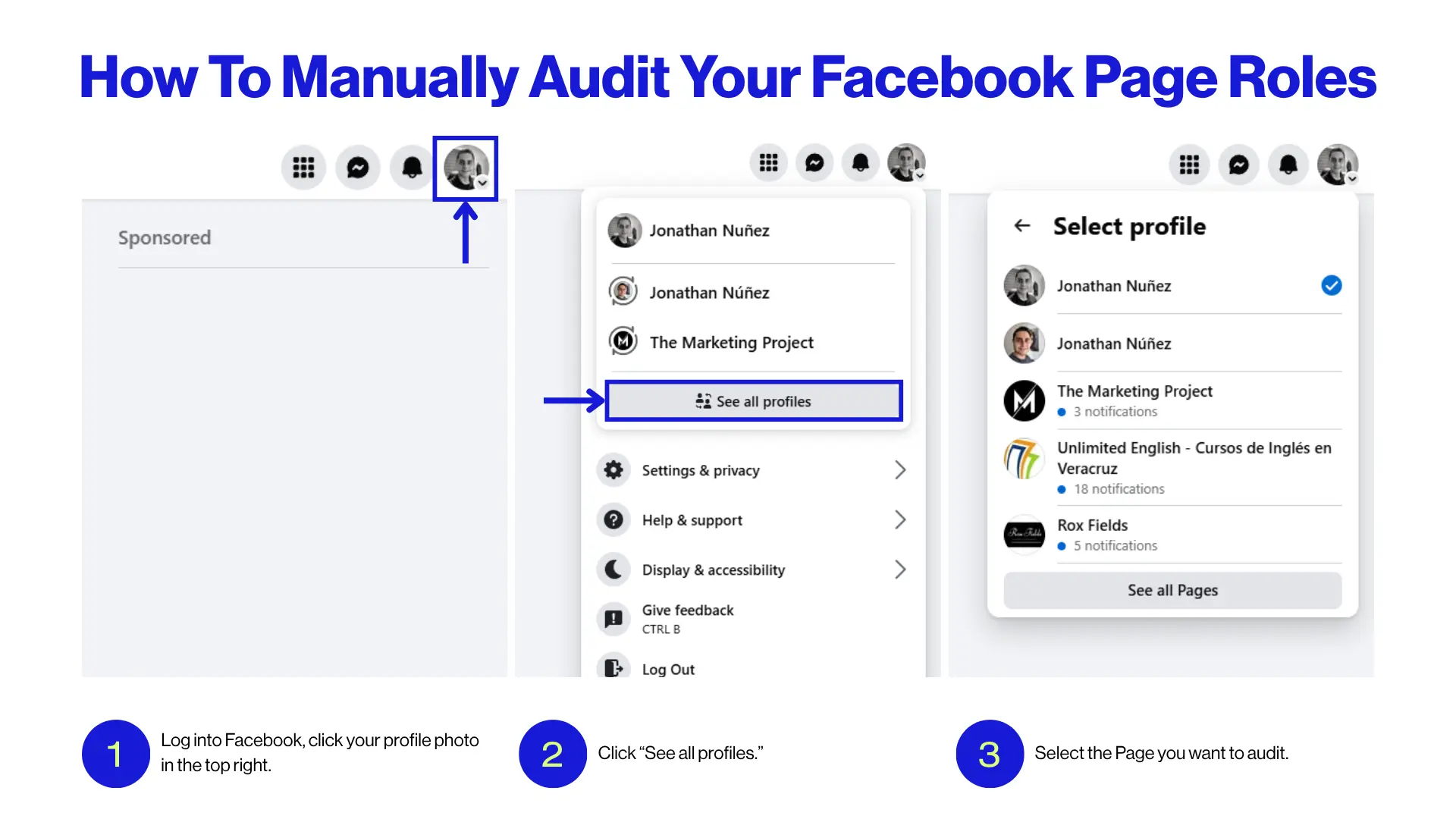 Log into Facebook, click your profile photo in the top right, then click “See all profiles.” Select the Page you want to audit.