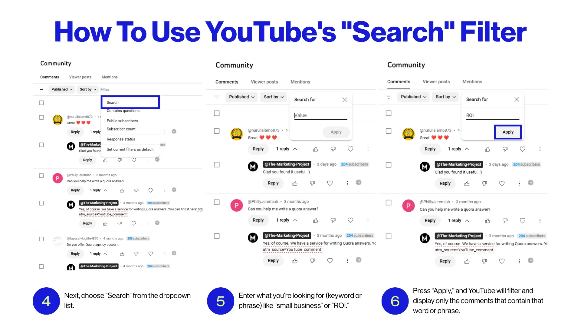 - Press “Apply,” and YouTube will filter and display only the comments that contain that word or phrase.