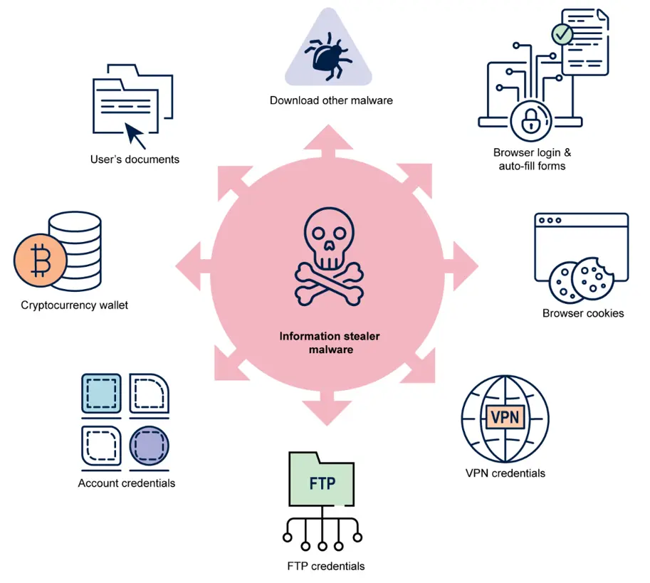 Malware (Info stealers) is malicious software designed to steal information, damage or take control of computers, servers, or networks without the victim's knowledge. It hides in seemingly harmless files like images or documents and spreads through compromised websites, phishing messages, or infected downloads.