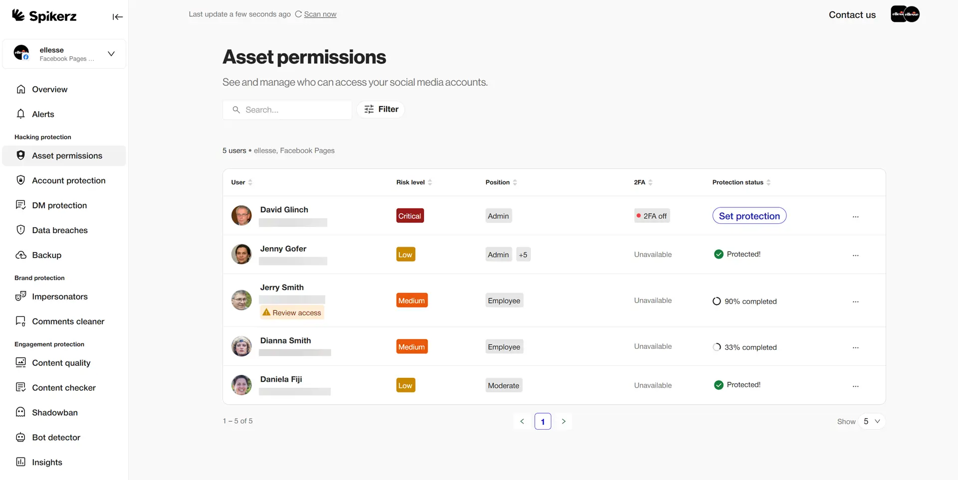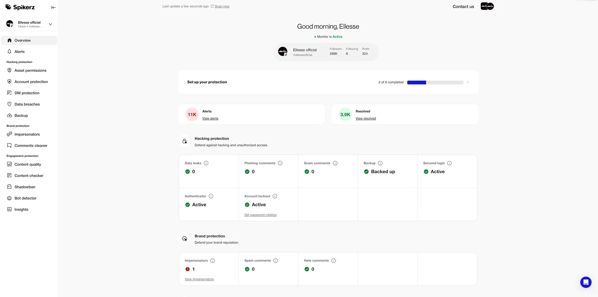 One of the easiest and most reliable ways to monitor accounts is using a social media security tool like Spikerz. Designed specifically for brands, creators, and enterprises, it continuously scans account activity to flag abnormal behavior. Thanks to this, you get a clear, real-time view of your social media health, making it easier to catch threats before they cause harm.