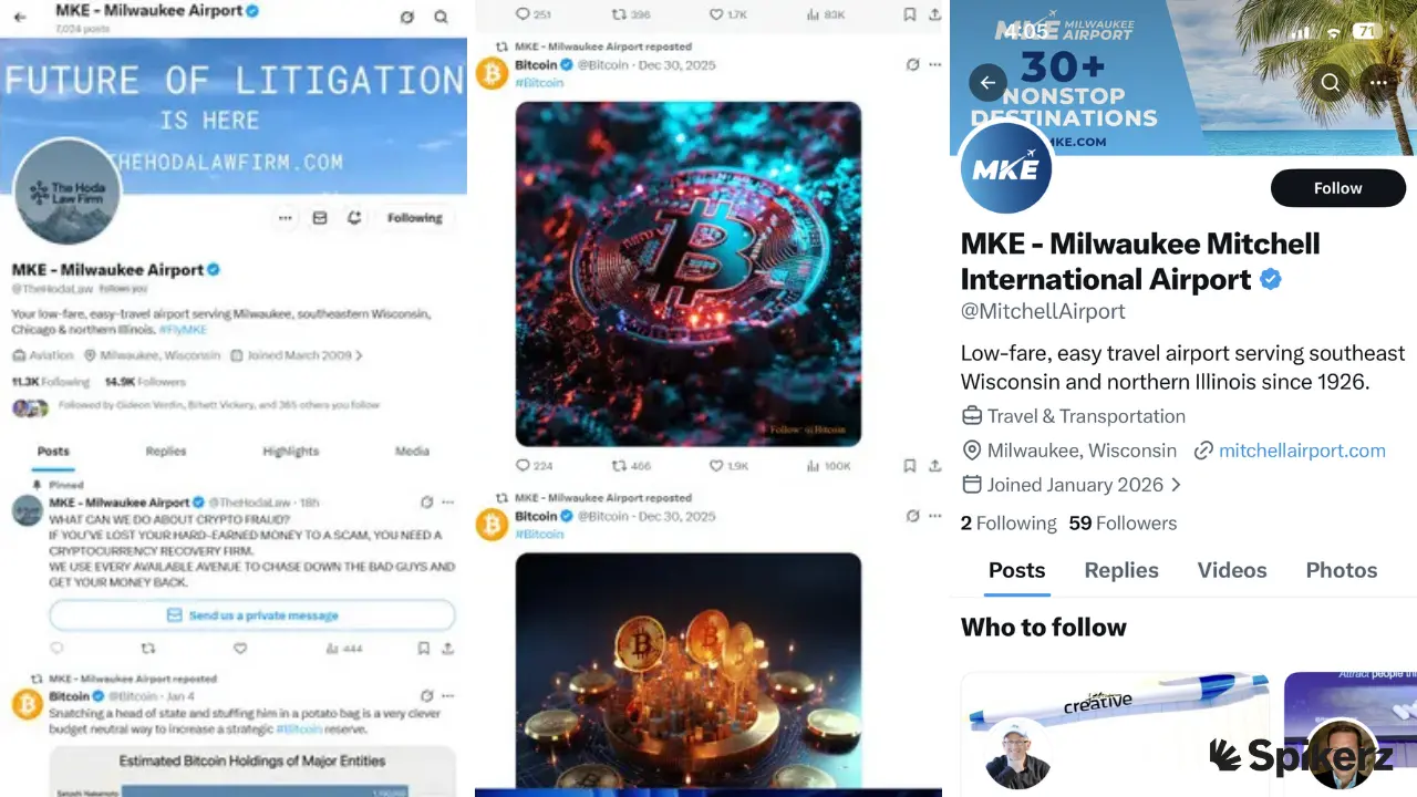 On January 16, 2026, the official X account for Milwaukee Mitchell International Airport was hacked. The verified “MKE – Milwaukee Airport” account was taken over by an entity pretending to be a law firm promoting cryptocurrency services. Then, all of the airport’s content was replaced with Bitcoin posts.