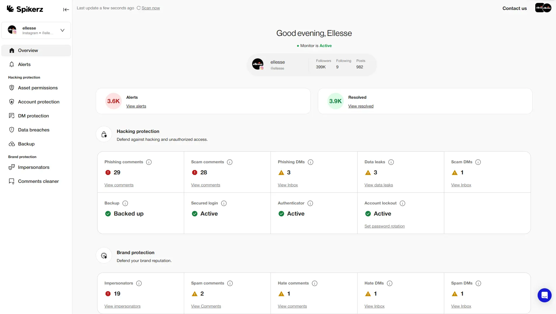 That said, one option you should consider is Spikerz. Spikerz is a social media security platform that provides 24/7 monitoring for hacking attempts, phishing, and impersonation. It connects through official APIs (no passwords needed) and uses AI to detect unauthorized access in real time. Spikerz also offers: