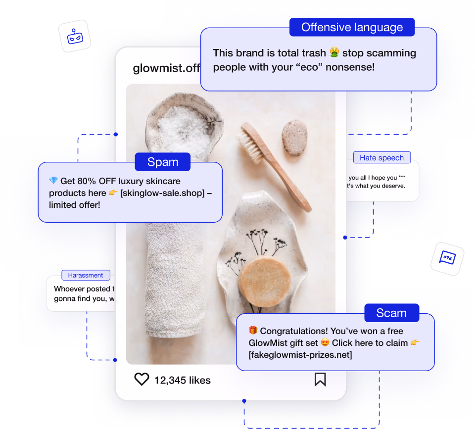 We monitor comments on your brand’s content 24/7, flagging potential bots before your customers have the chance to fall for scams.